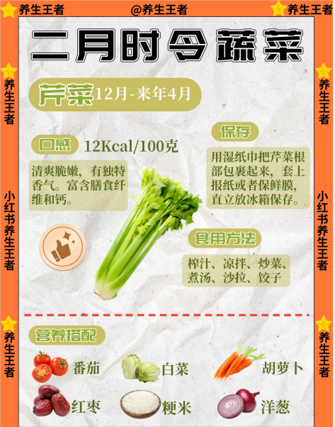 二月正值早春,氣溫逐漸上升,萬物復蘇,各類植物抽發新芽。不少應季蔬菜陸續上市,有芹菜、香椿、蘿卜、枸杞葉、薺菜、春筍、韭菜、菠菜等,吃的就是一個鮮!