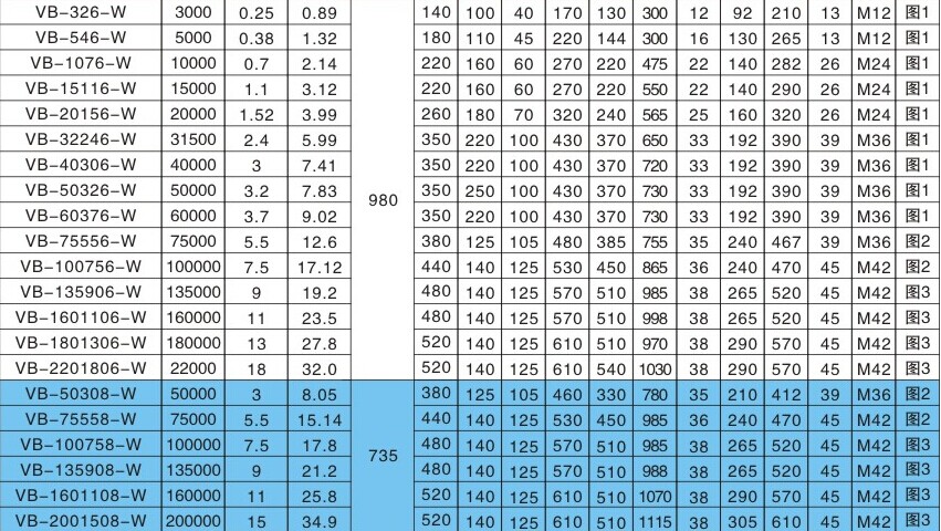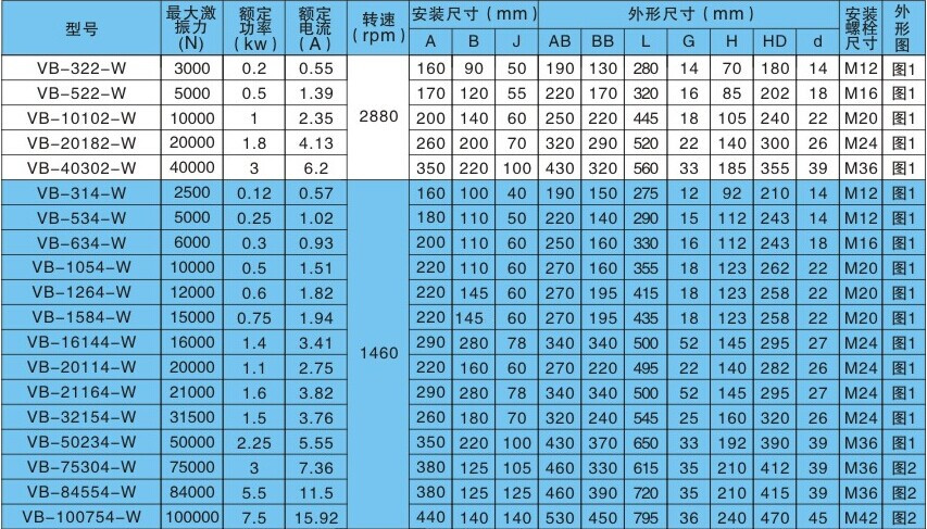 VB振動(dòng)電機(jī)的各項(xiàng)參數(shù)和其它系列的振動(dòng)電機(jī)都可以互相通用,多用于各種型號(hào)的振動(dòng)篩分設(shè)備作為主要振動(dòng)力來源,具體型號(hào)可參考下表。